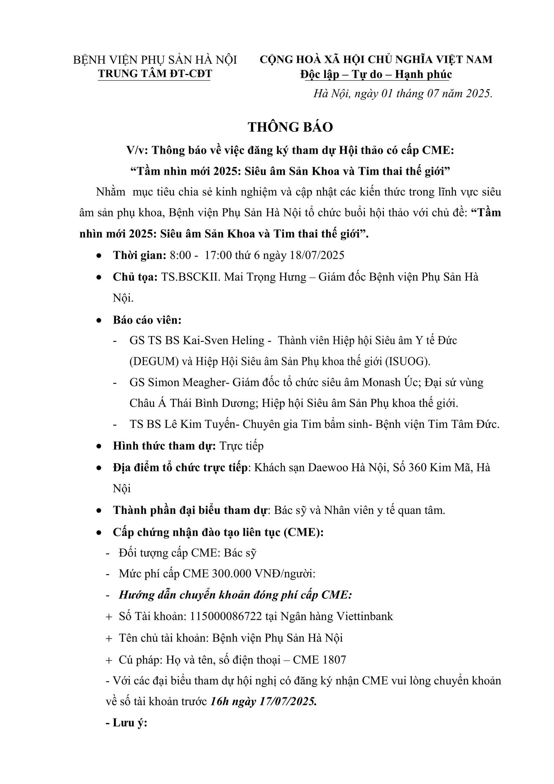 – Với các đại biểu tham dự hội nghị có đăng ký nhận CME vui lòng chuyển khoản về số tài khoản trước 16h ngày 17/07/2025.