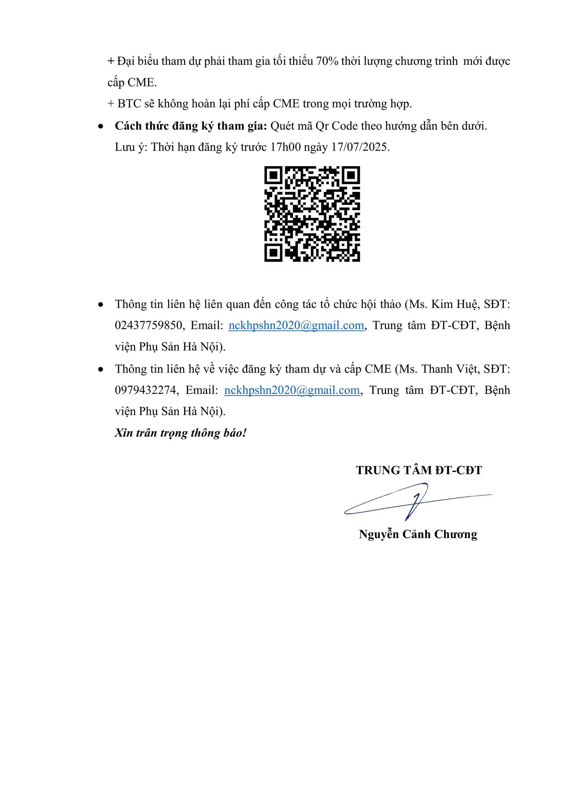 - Thông tin liên hệ về việc đăng ký tham dự và cấp CME (Ms. Thanh Việt, SĐT: 0979432274, Email: nckhpshn2020@gmail.com, Trung tâm ĐT-CĐT, Bệnh viện Phụ Sản Hà Nội).