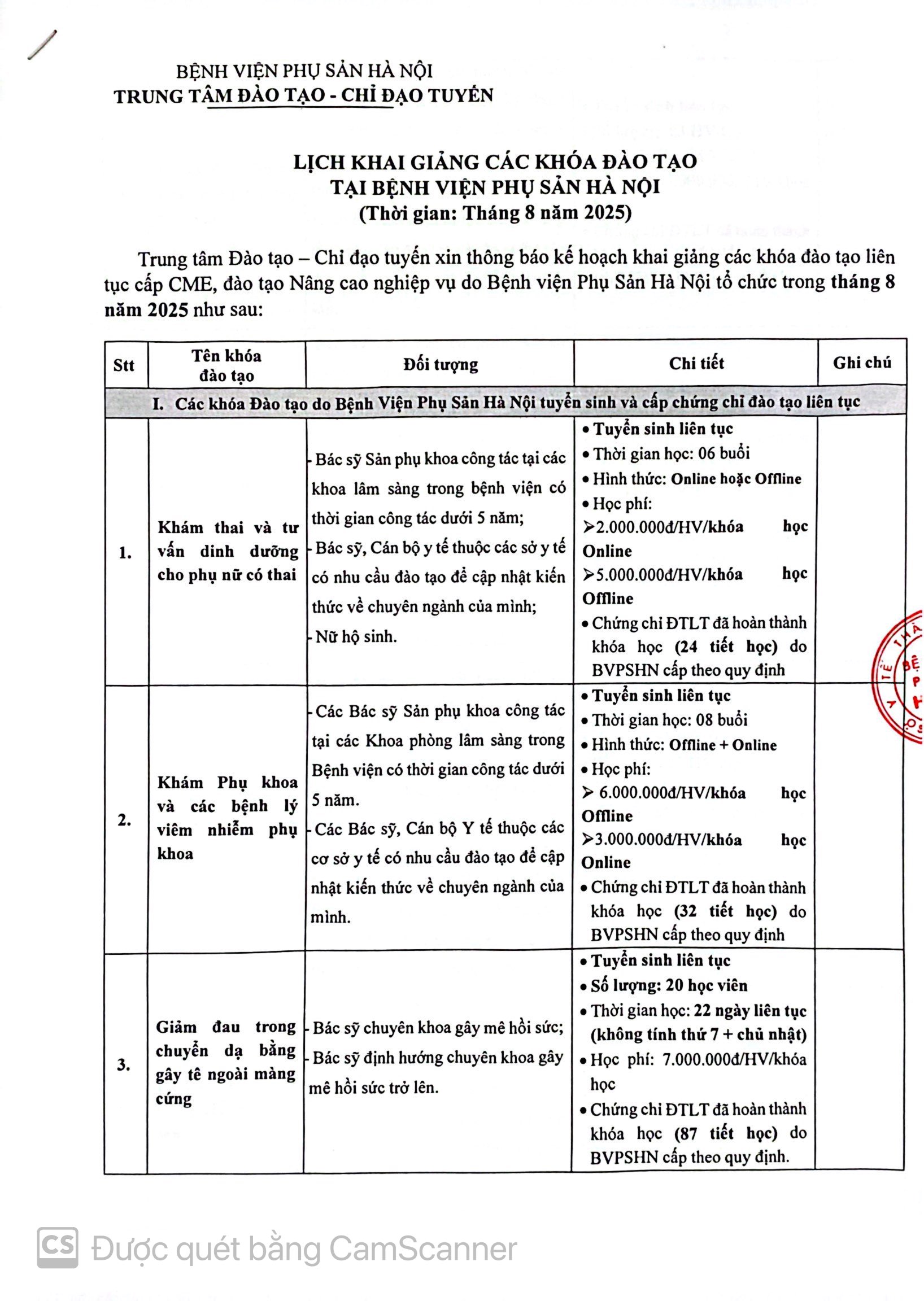 Trung tâm Đào tạo – Chỉ đạo tuyến xin gửi Lịch khai giảng các khoá đào tạo trong tháng 8/2025.